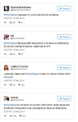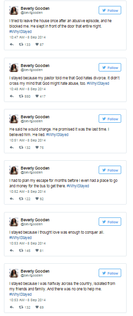 Writer Beverly Gooden had heard enough. “I was watching the responses to the TMZ on my timeline, and I noticed a trend. People were asking ‘why did she marry him?’ and ‘why didn’t she leave him,'” Gooden told Mic. “When I saw those tweets, my first reaction was shame. The same shame that I felt back when I was in a violent marriage. It’s a sort of guilt that would make me crawl into a shell and remain silent. But today, for a reason I can’t explain, I’d had enough. I knew I had an answer to everyone’s question of why victims of violence stay. I can’t speak for Janay Rice, I can only speak for me.”