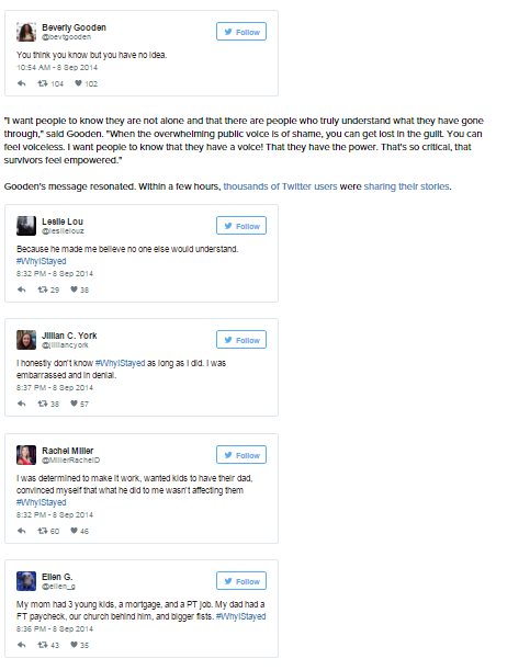 Gooden decided to change the conversation. She called on her followers to share their stories of domestic abuse with the hashtag #WhyIStayed in an effort to draw awareness to the complexities of domestic violence.